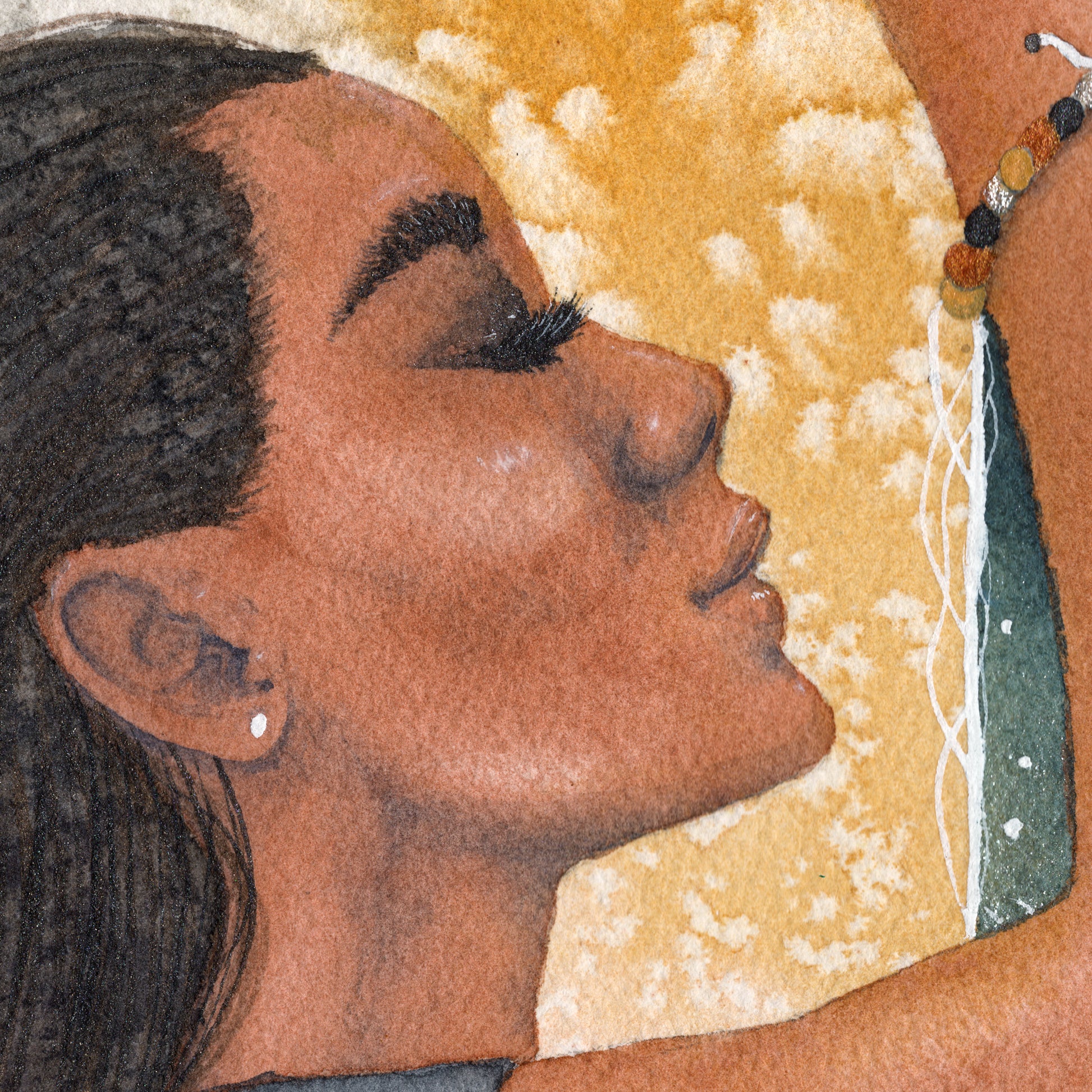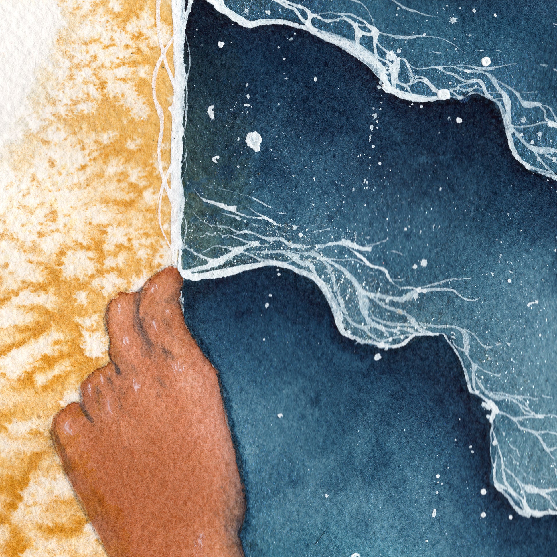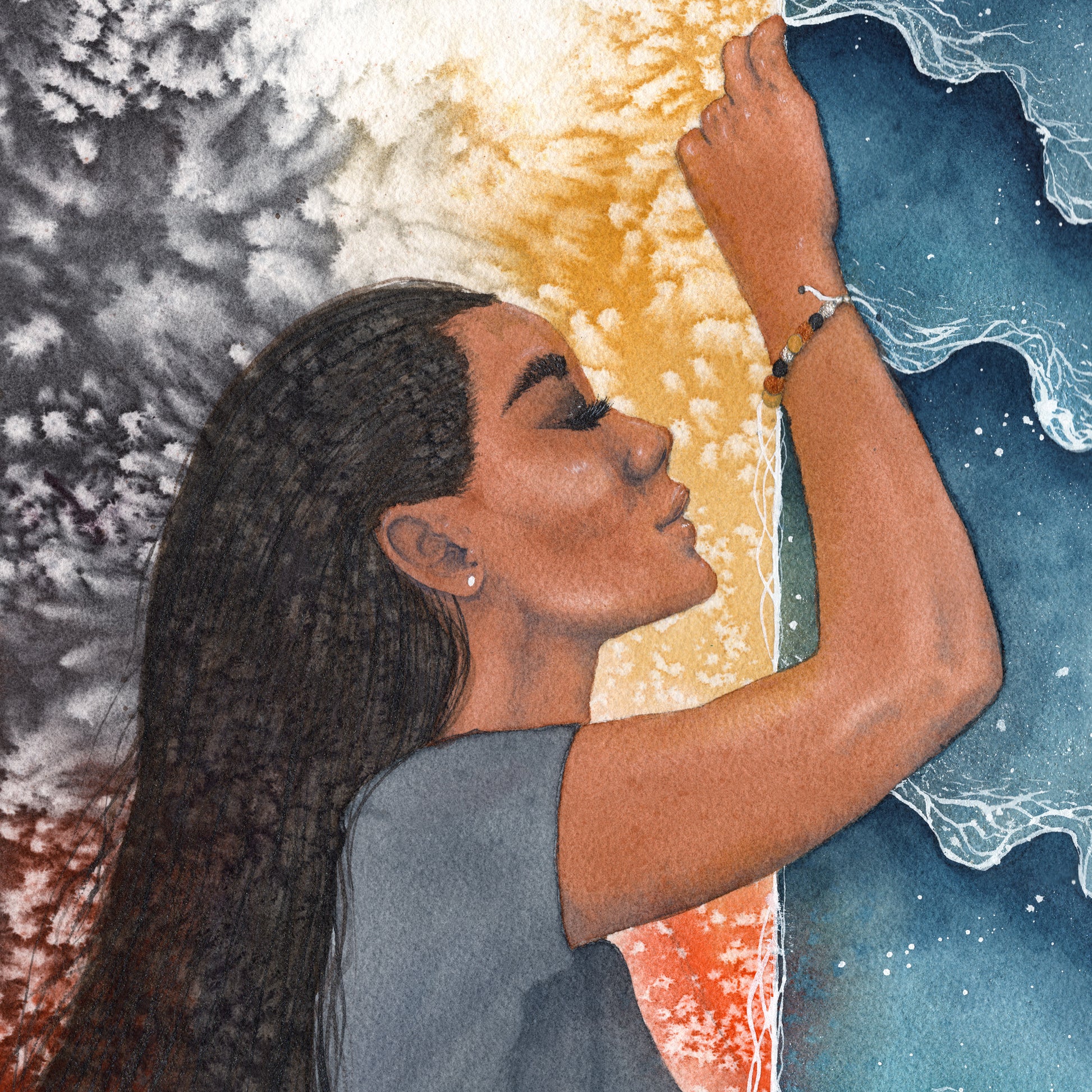 By The Shores Of Gitche Gumee, the daughters of the first nations are one with the waters. Unbroken, unstoppable and unhindered. Painted with handmade watercolor paints made from local Michigan honey, local pigments and beachglass, this pays tribute to the modern Anishinaabe.