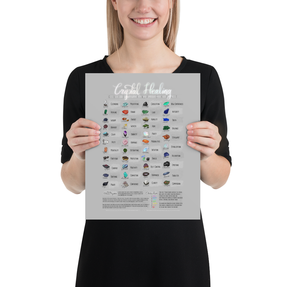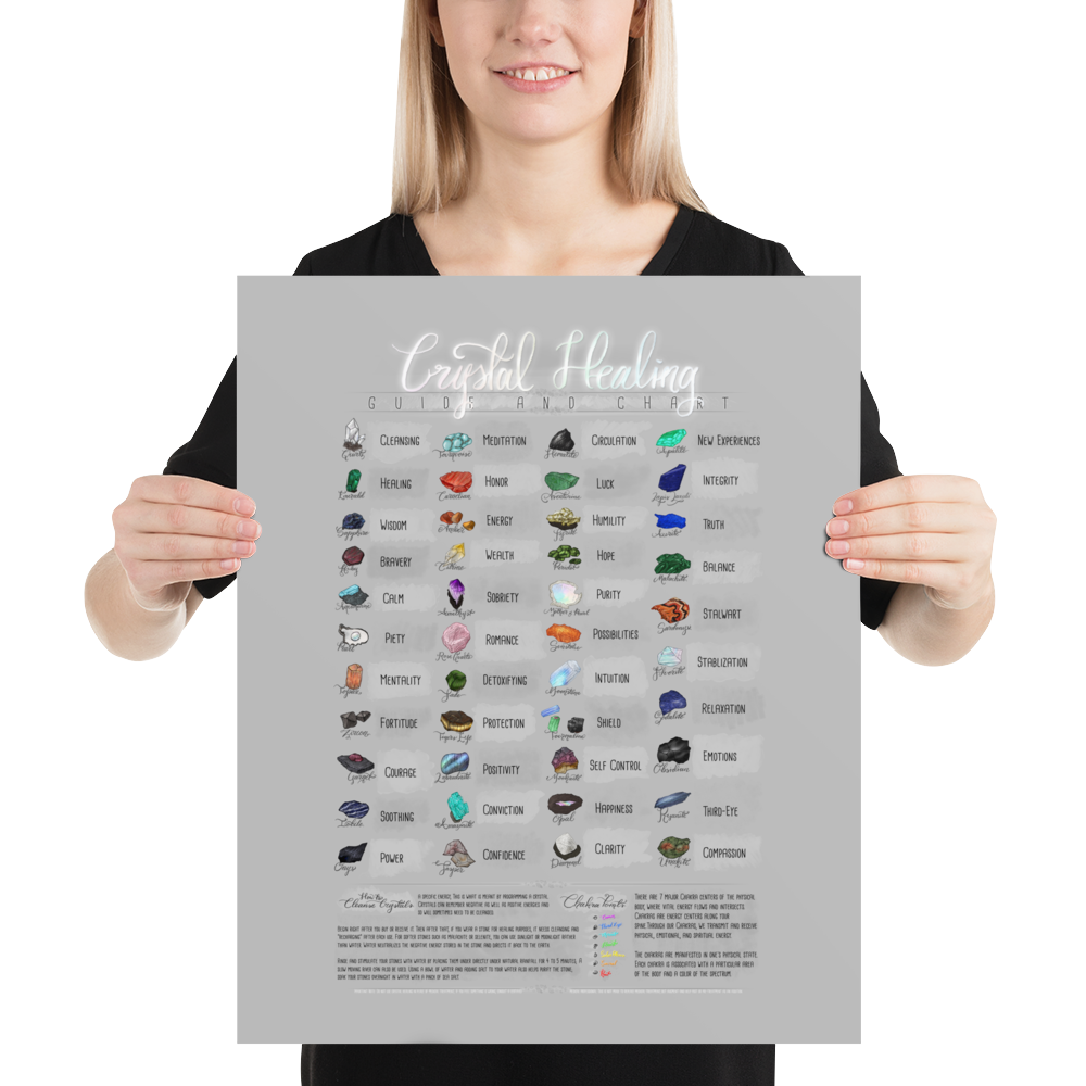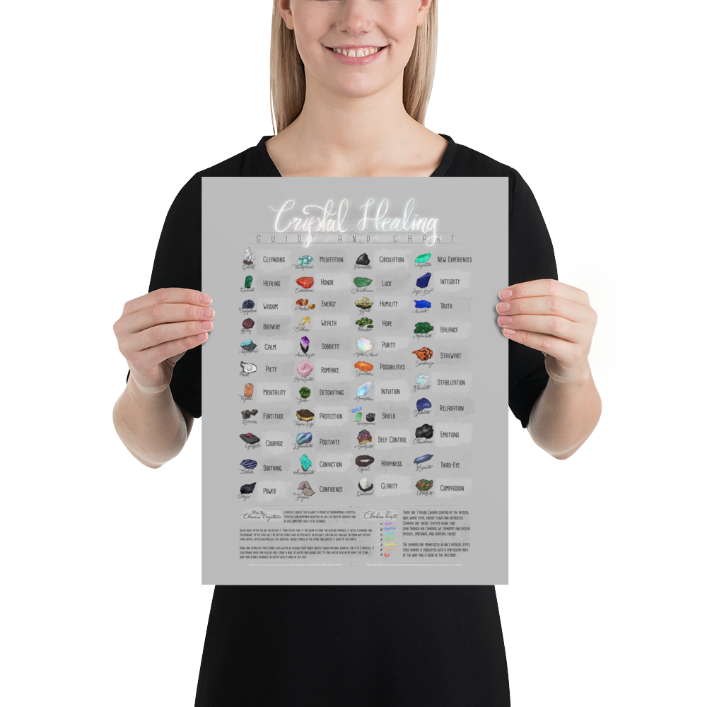 A comprehensive and hand-illustrated crystal healing infographic chart and guide.