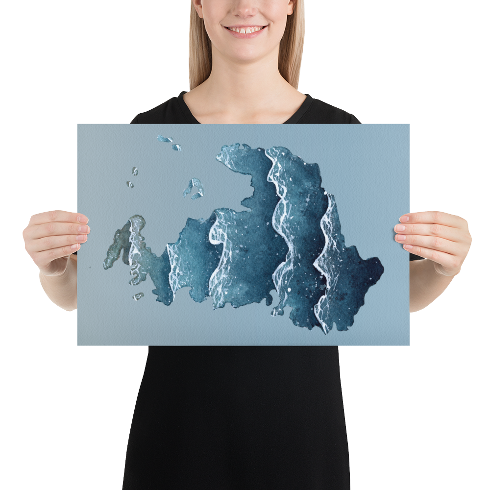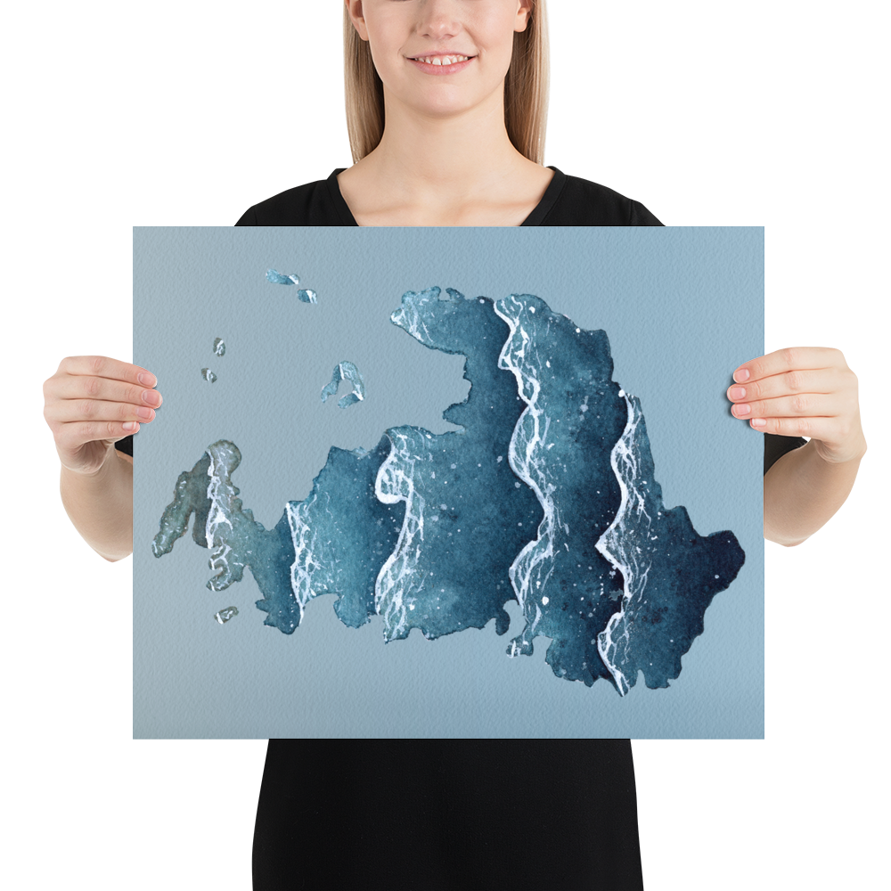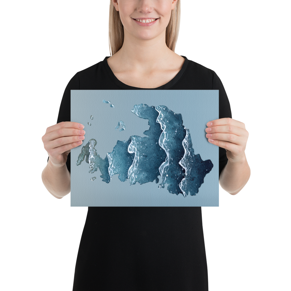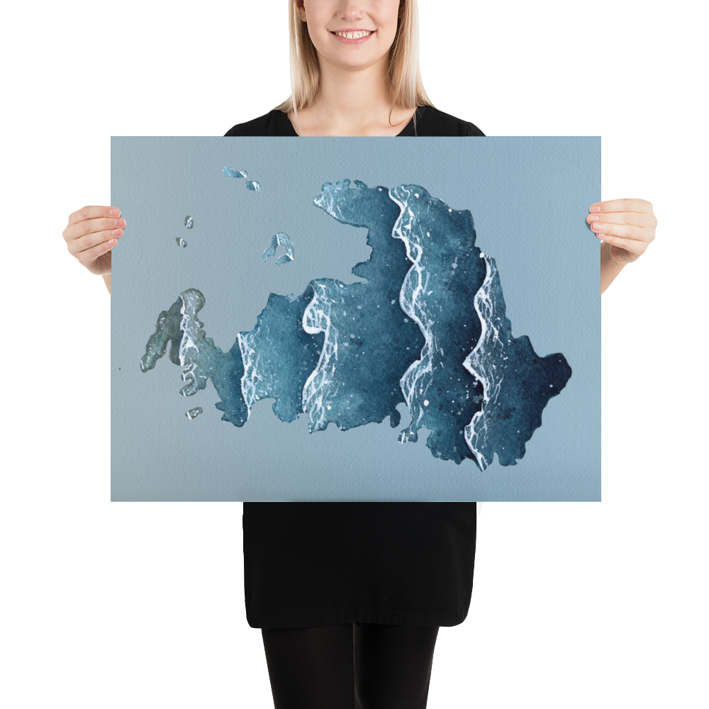 A watercolor silhouette of Drummond Island located in the Upper Peninsula of Michigan and a unique way to either showcase your pride in it or remember a trip to it. This print is made from a hand-painted watercolor painting, painted with handmade paints made from sustainably and ethically collected pigments and watercolor paints I made myself from the Upper Peninsula of Michigan.