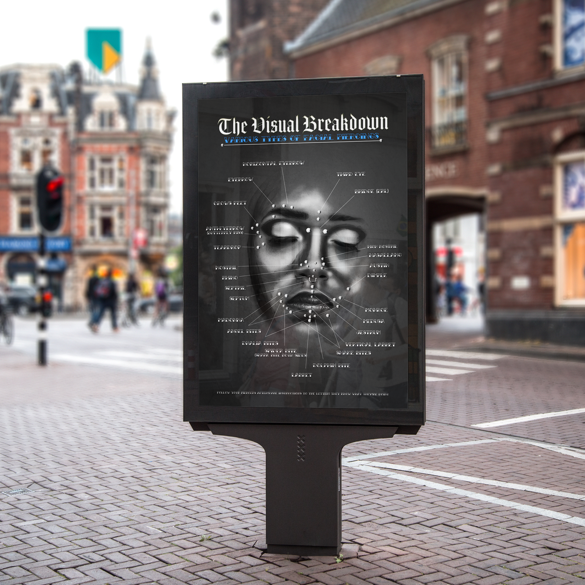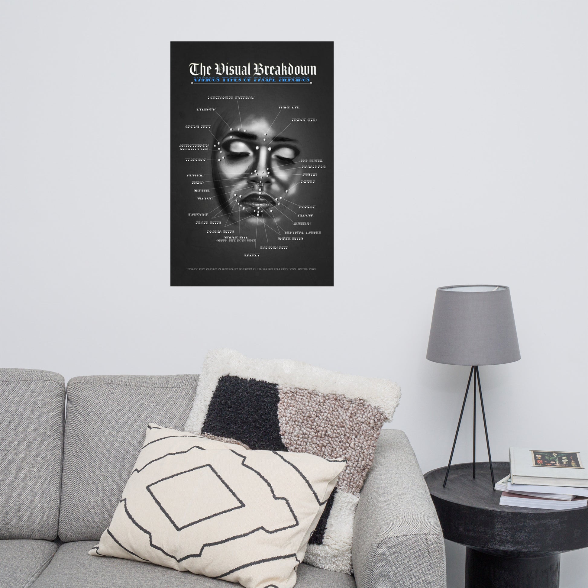 A comprehensive, well researched and complete facial piercing chart. Intended for professional use, but perfect for piercing enthusiasts. Matching blue grunge version to the Ear Piercing Chart for a matching set or you can buy alone.