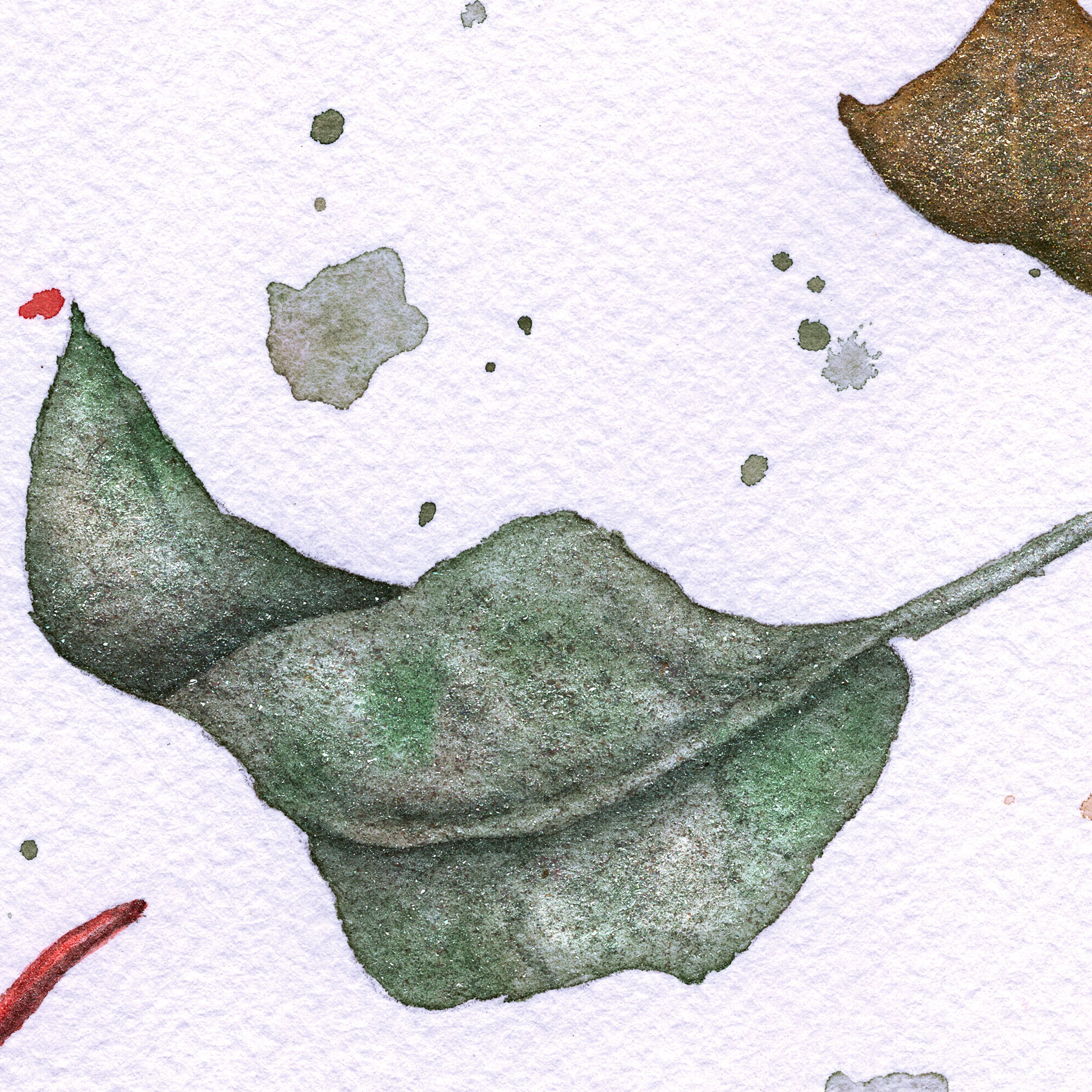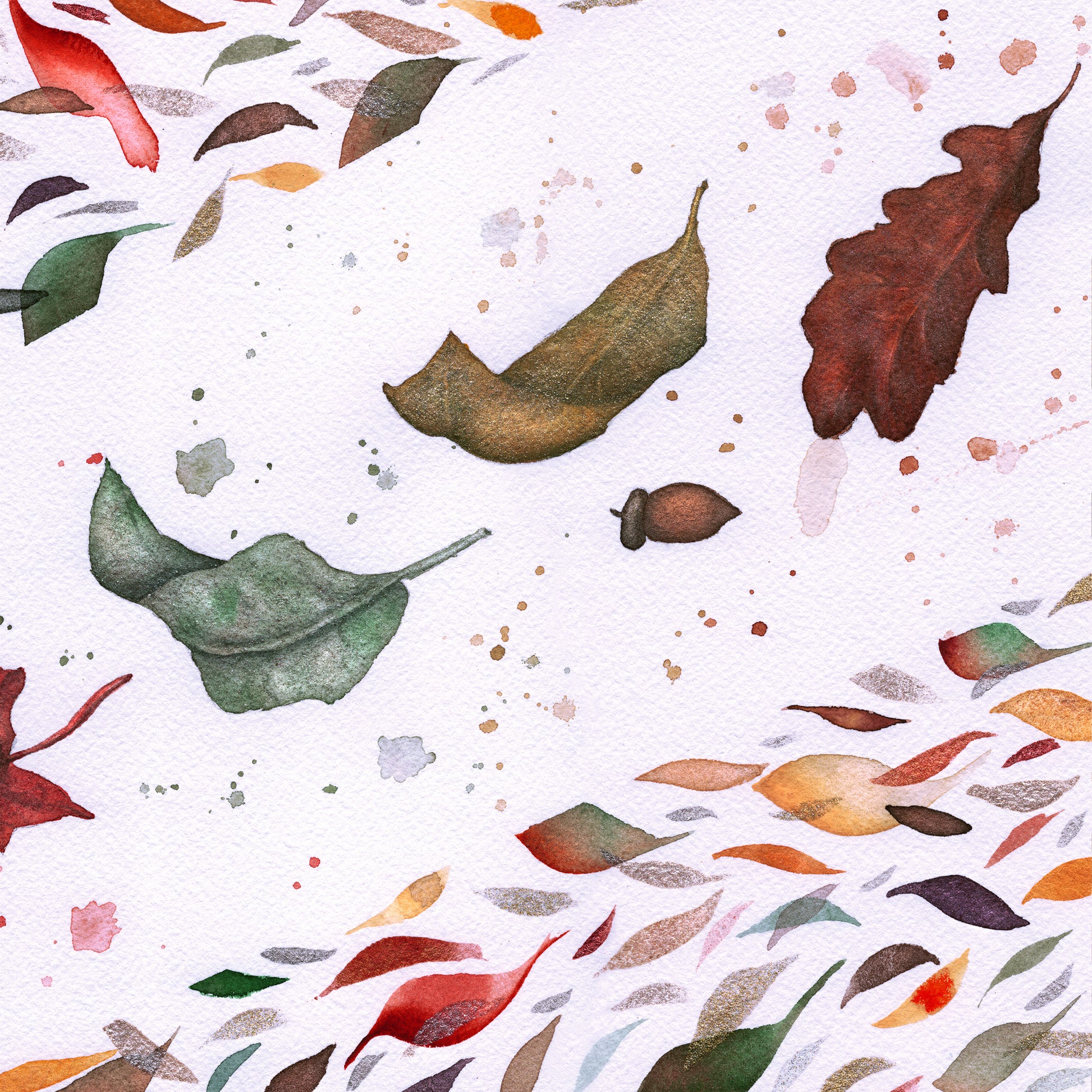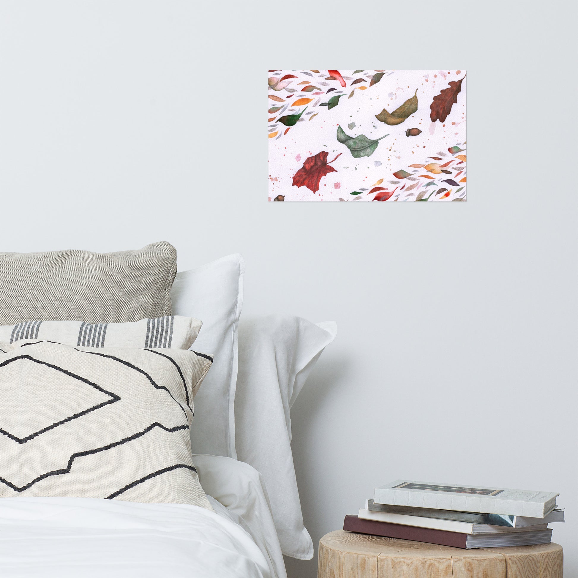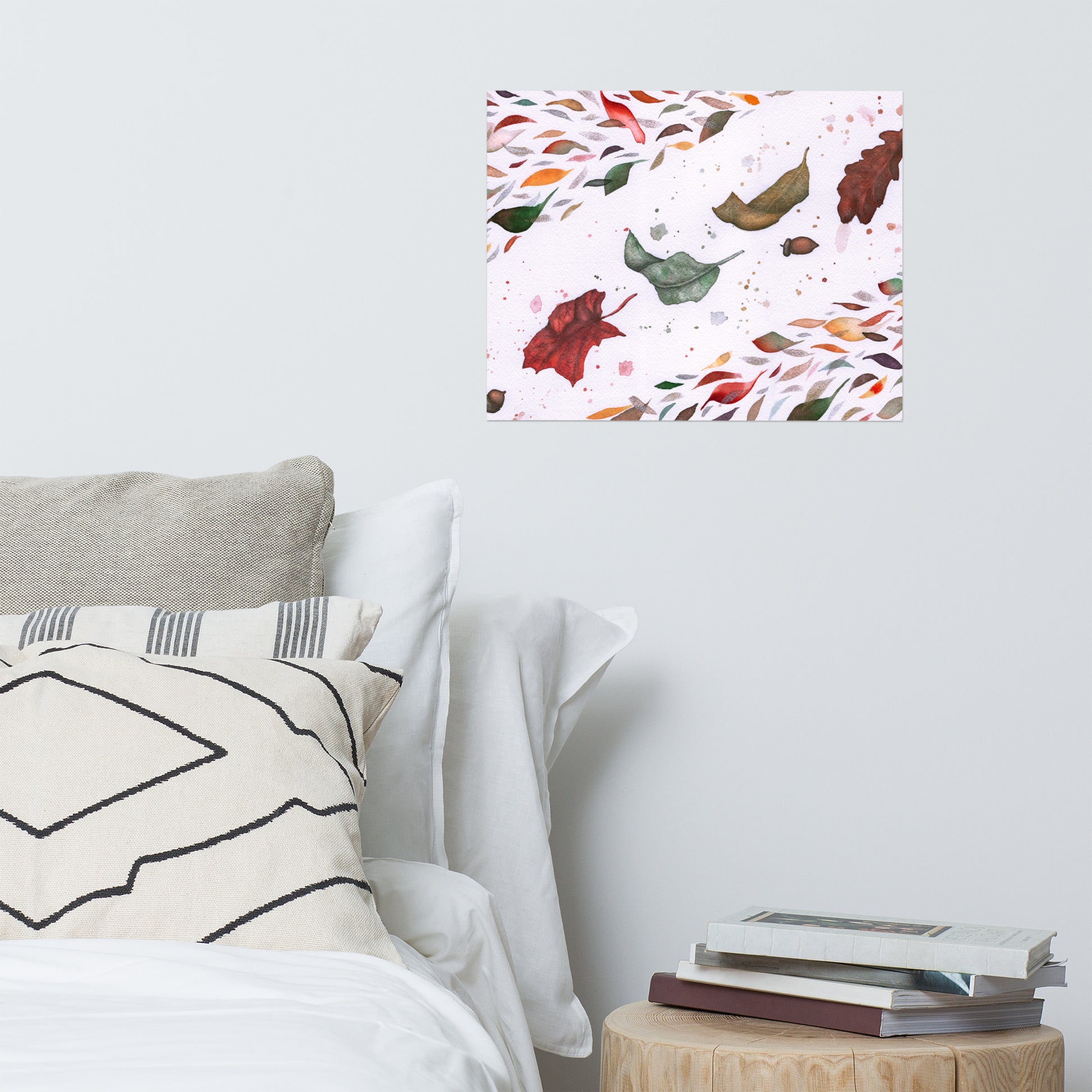 Watercolor painting print from a painting of fall leaves in the depths of autumn color with loose watercolour florals surrounding realistic leaves.