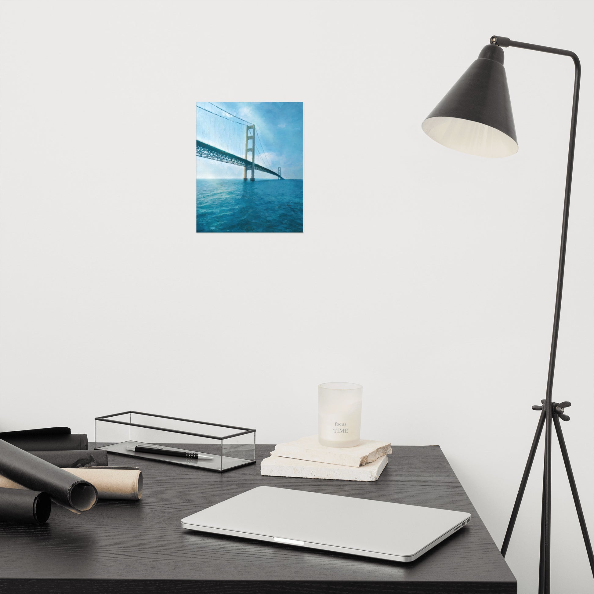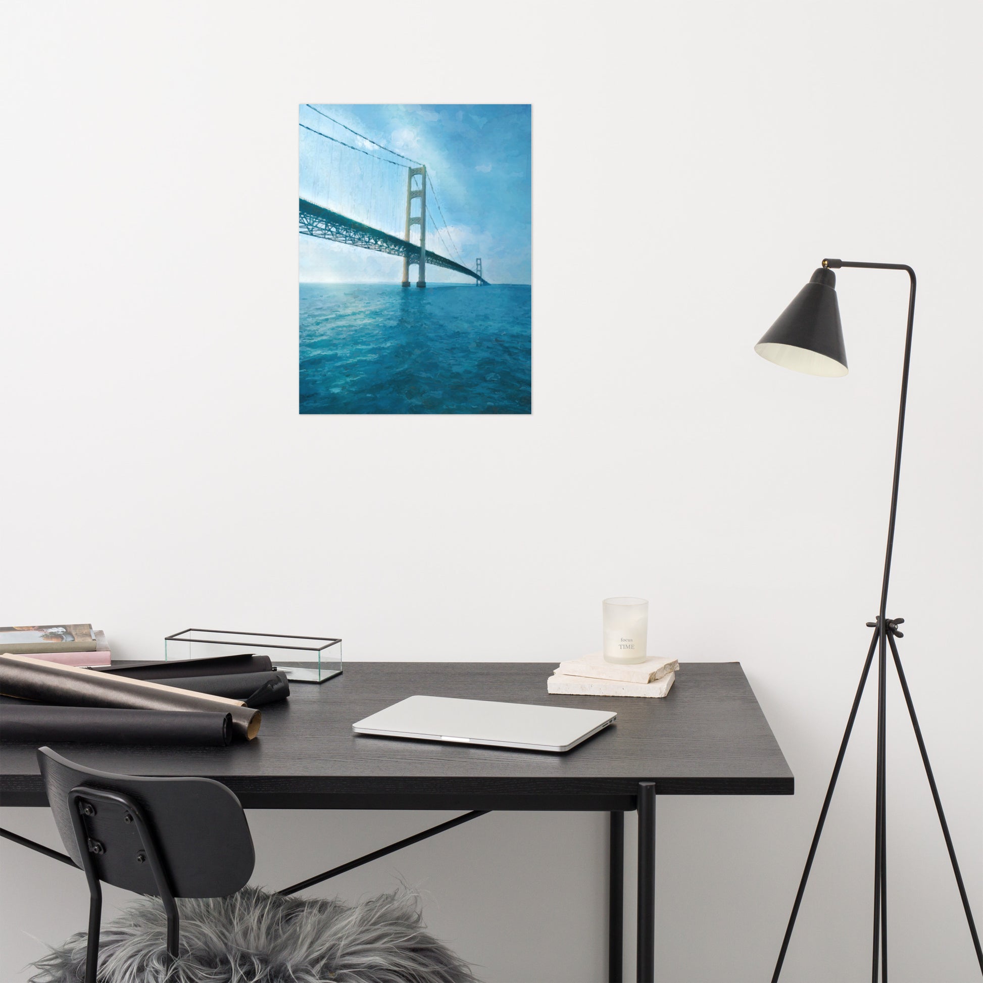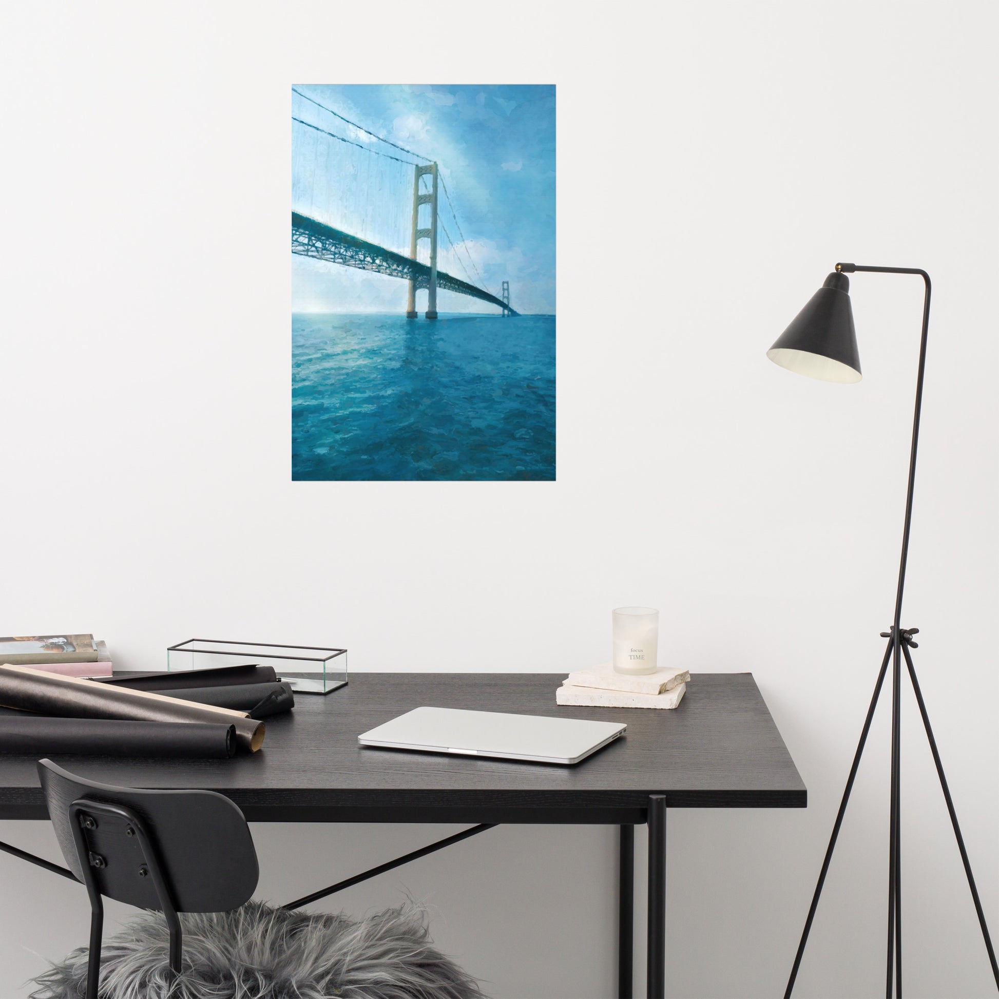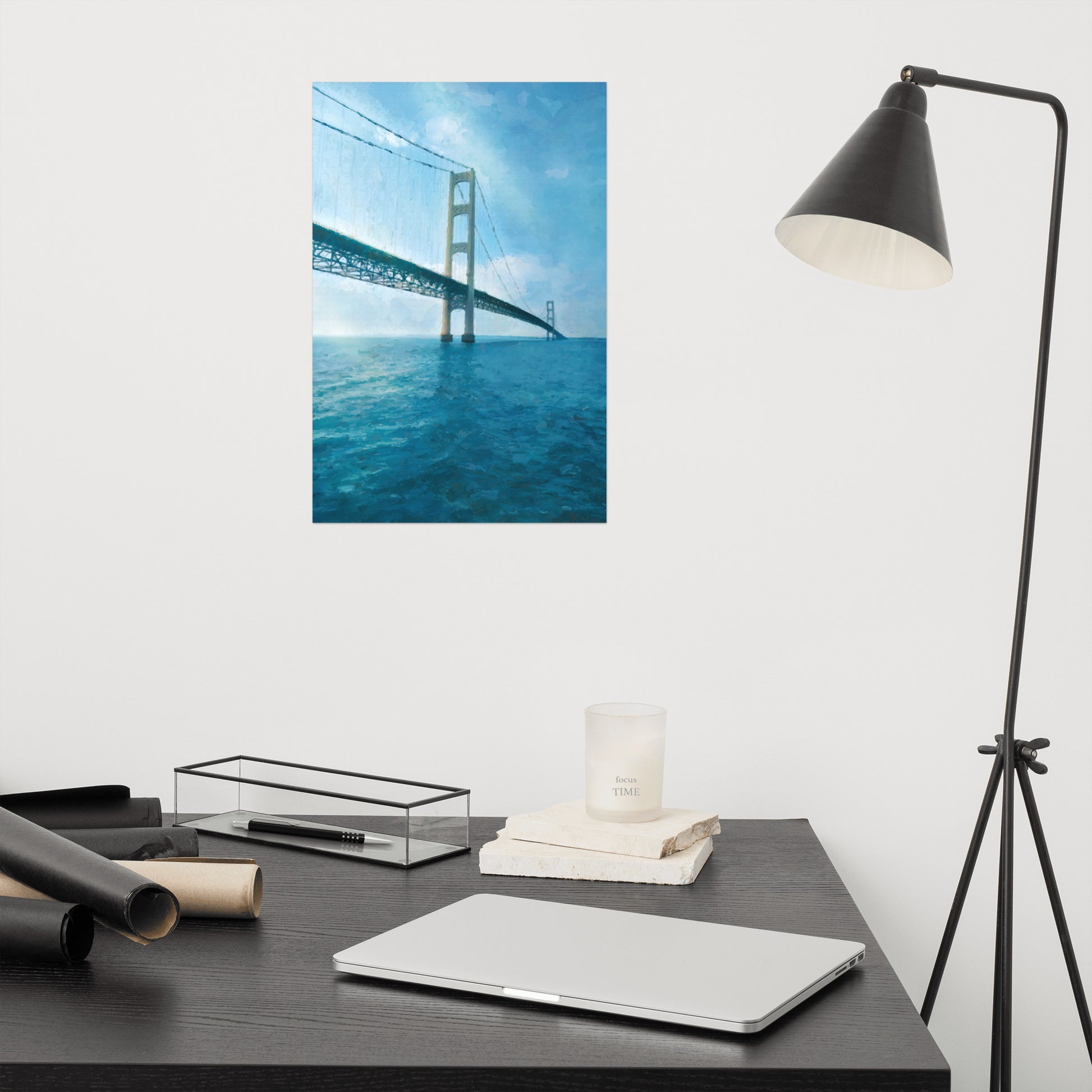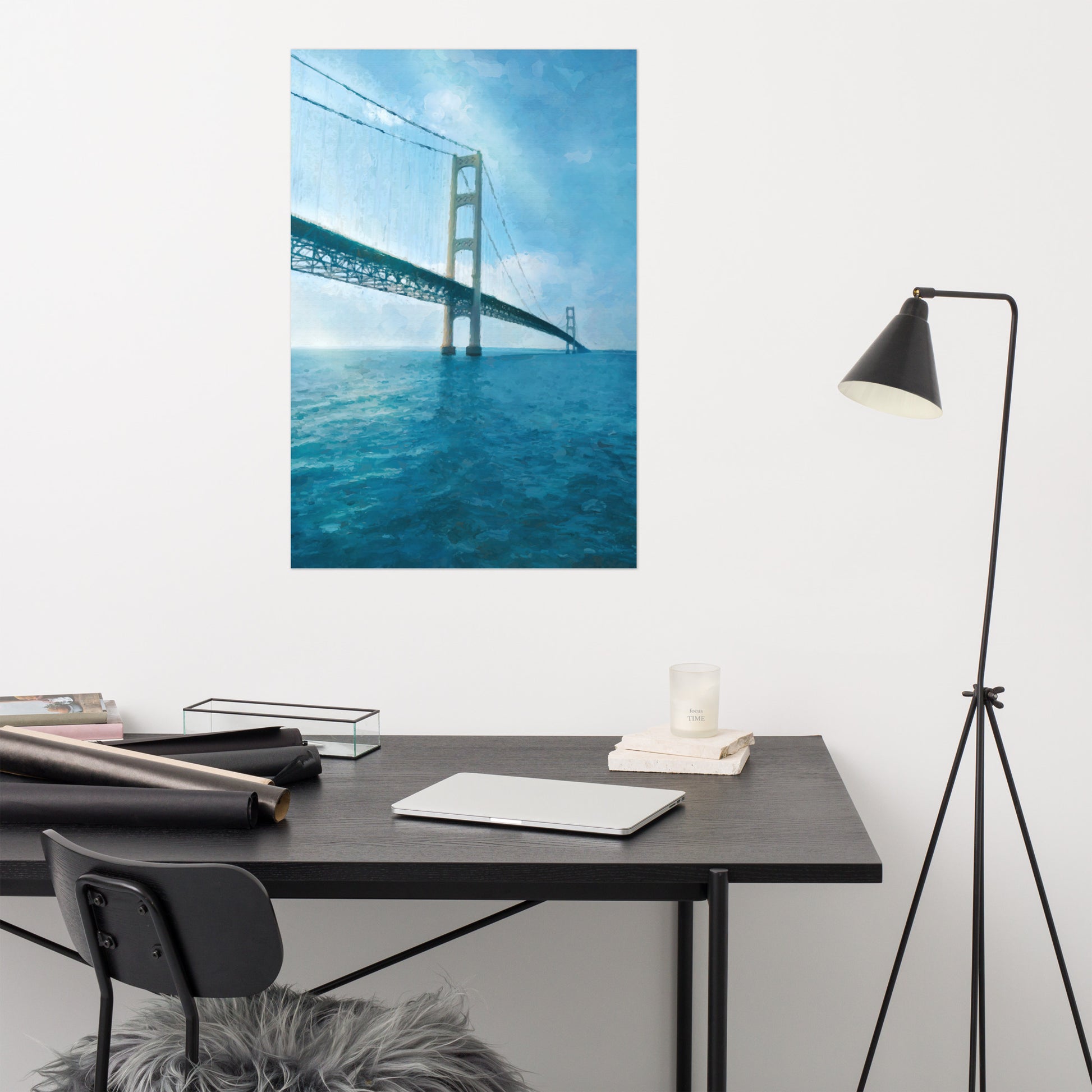 A painting of the Mackinac Bridge that traverses the Straights of Mackinac. Iconic and beautiful to behold.
