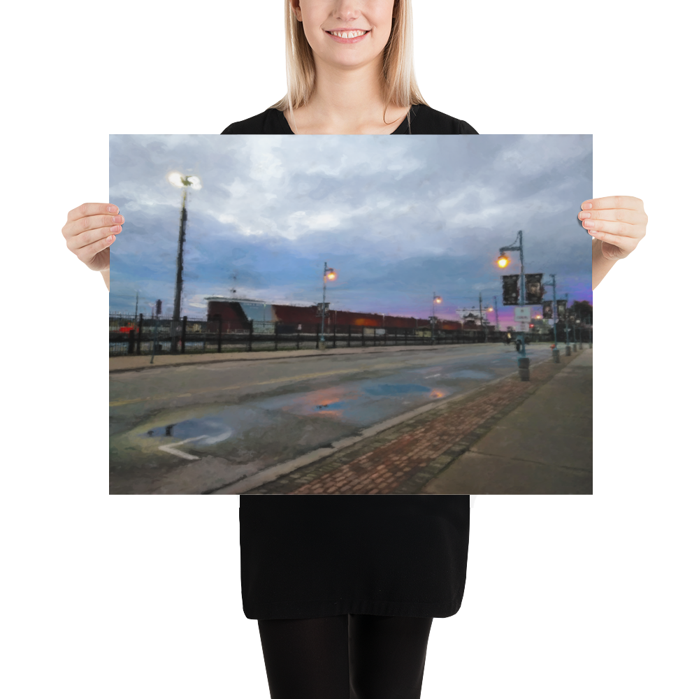 Painting of the Sault Locks in Sault Ste. Marie, Michigan, just as dawn is breaking after the rain. Quintessential to commerce, the Sault Locks are something to behold, especially when a freighter goes right next to your car.