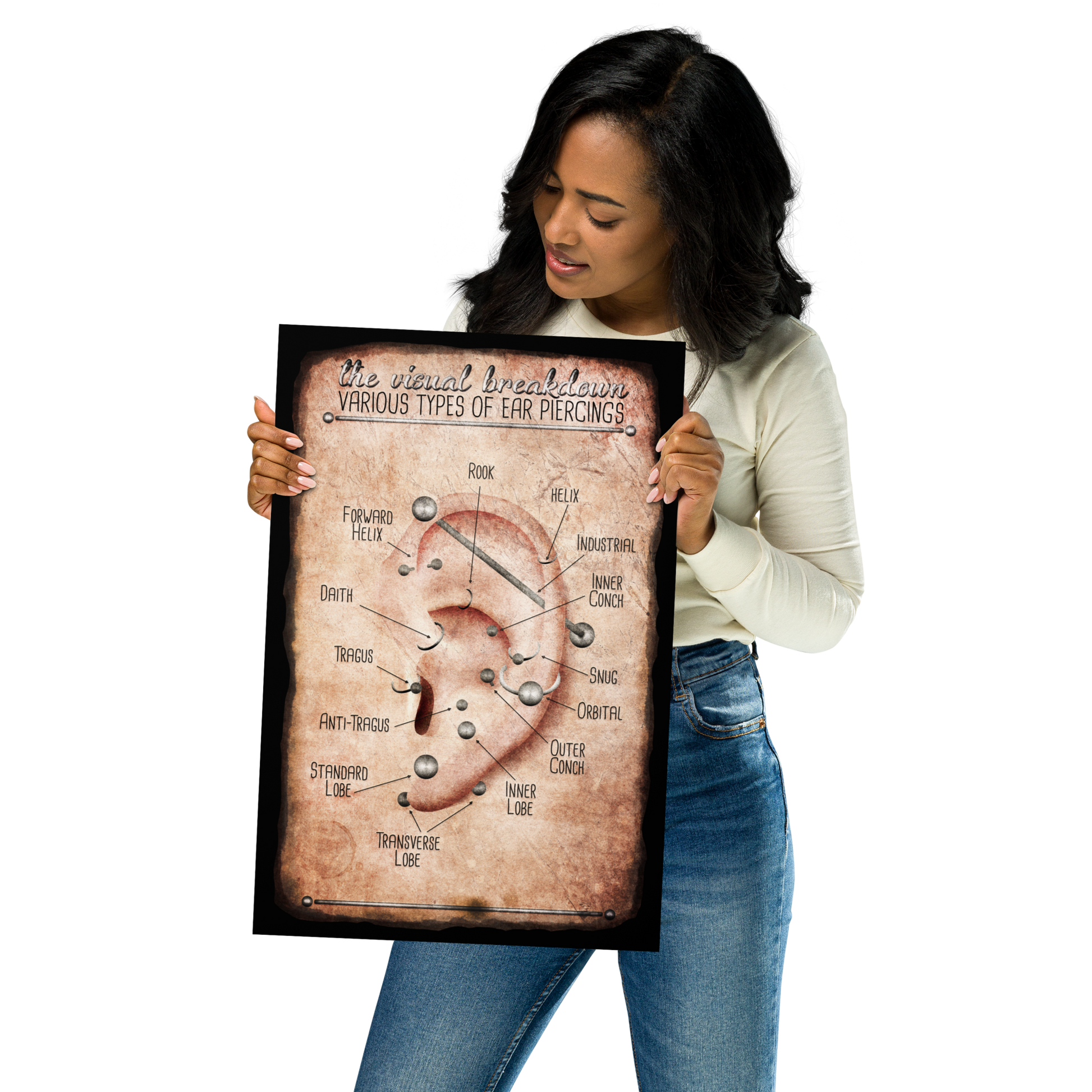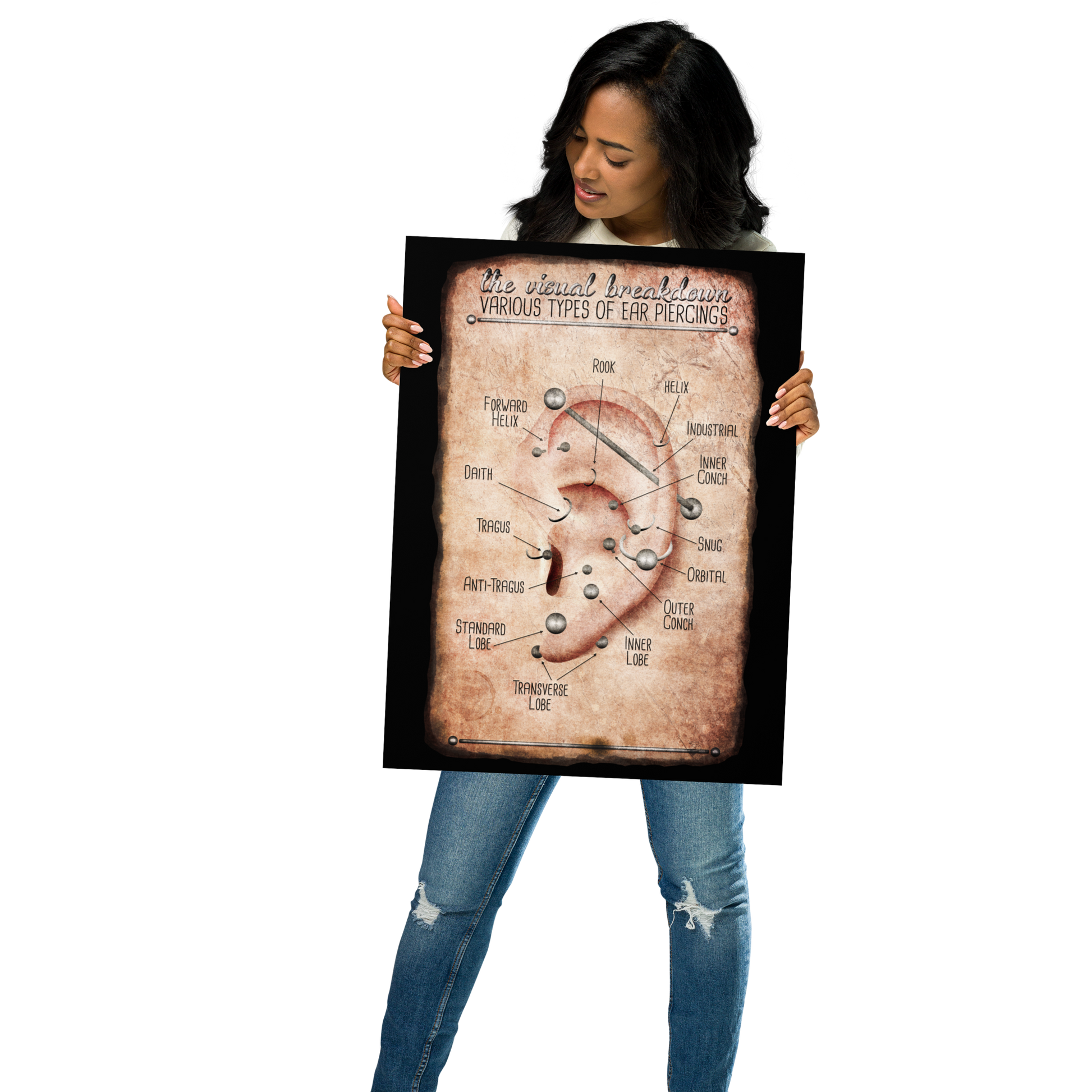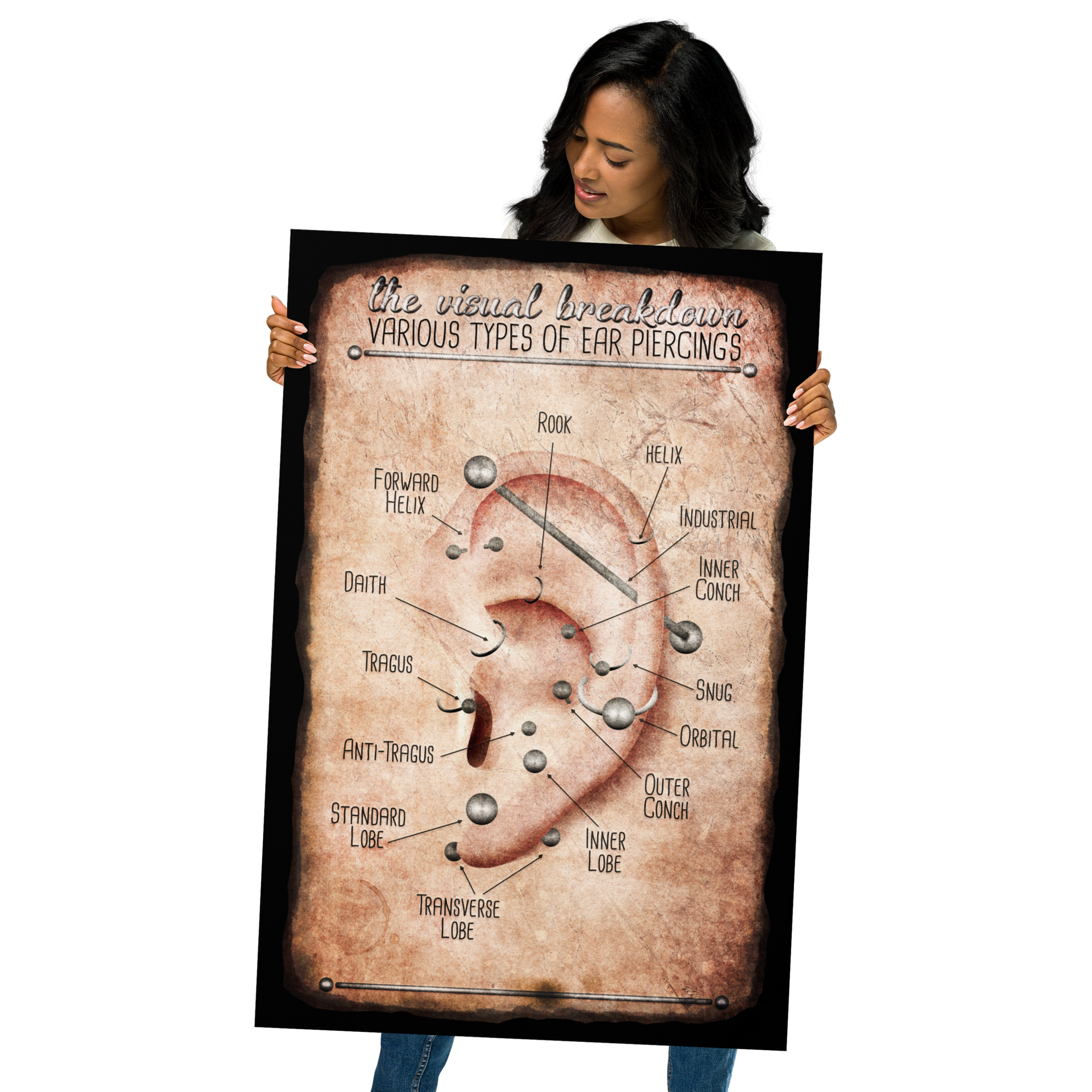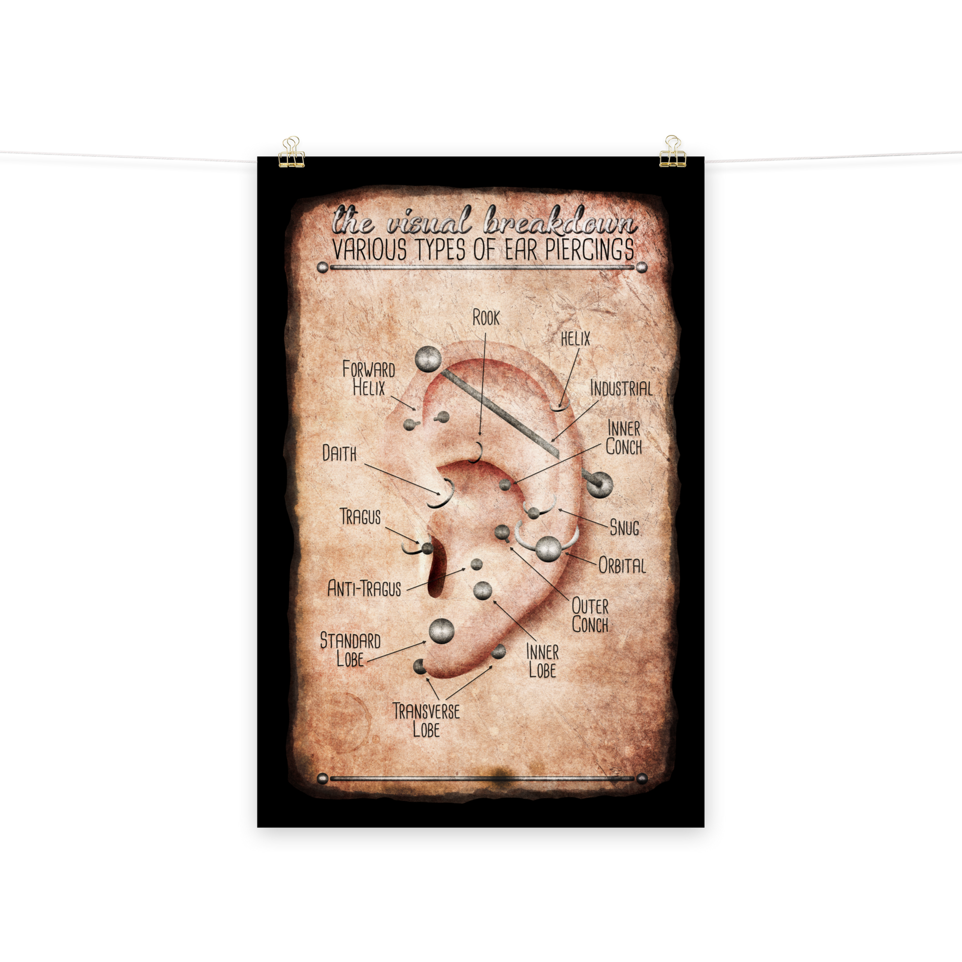 A vintage, old-style ear piercing infographic chart; complete and comprehensive on various ear piercings, their name and where they are.