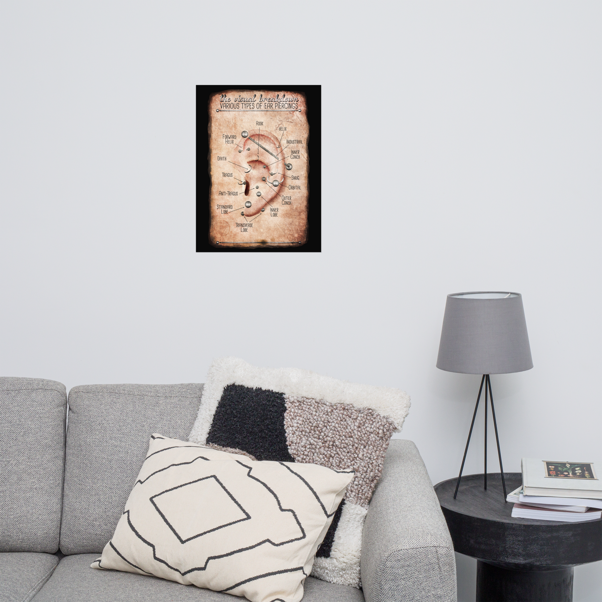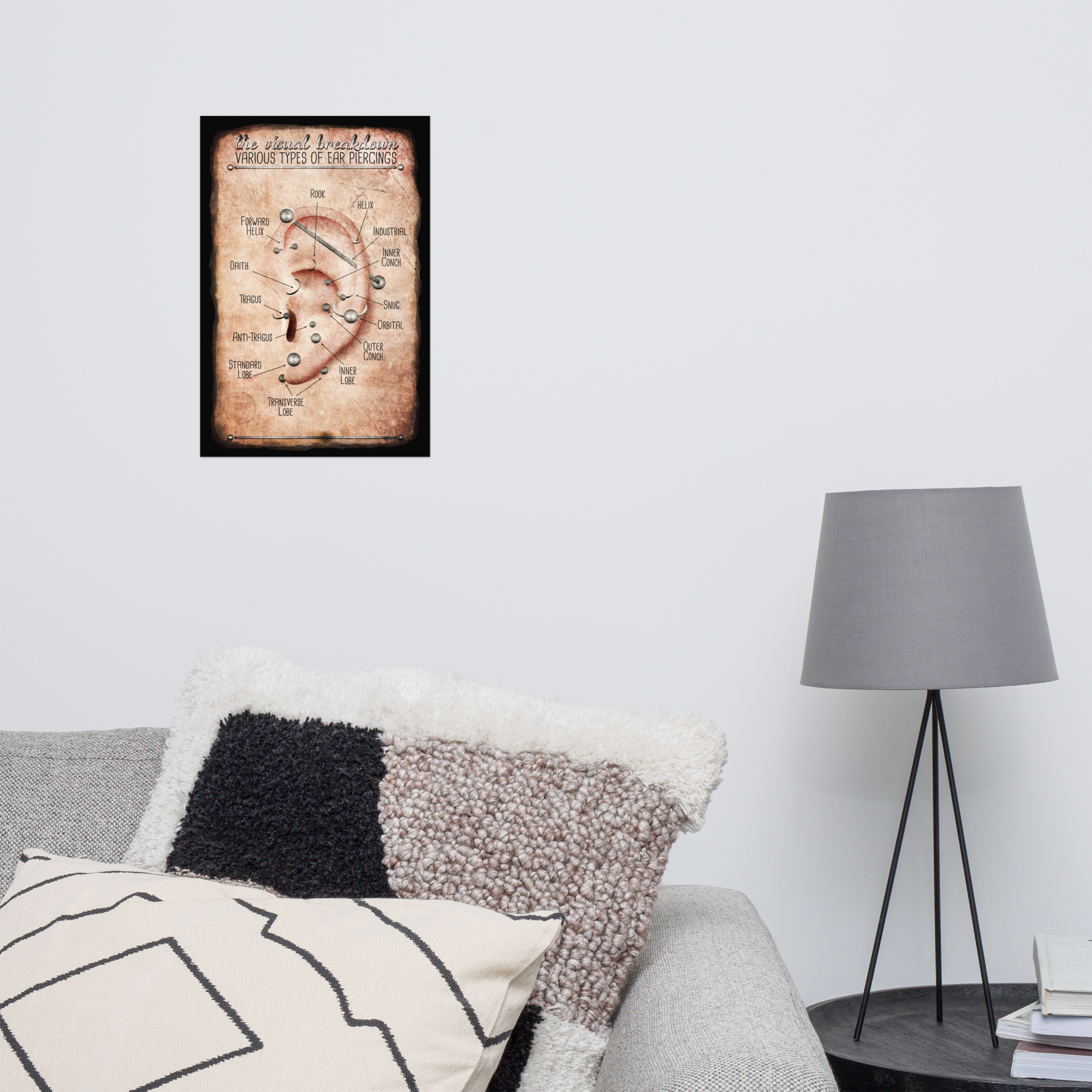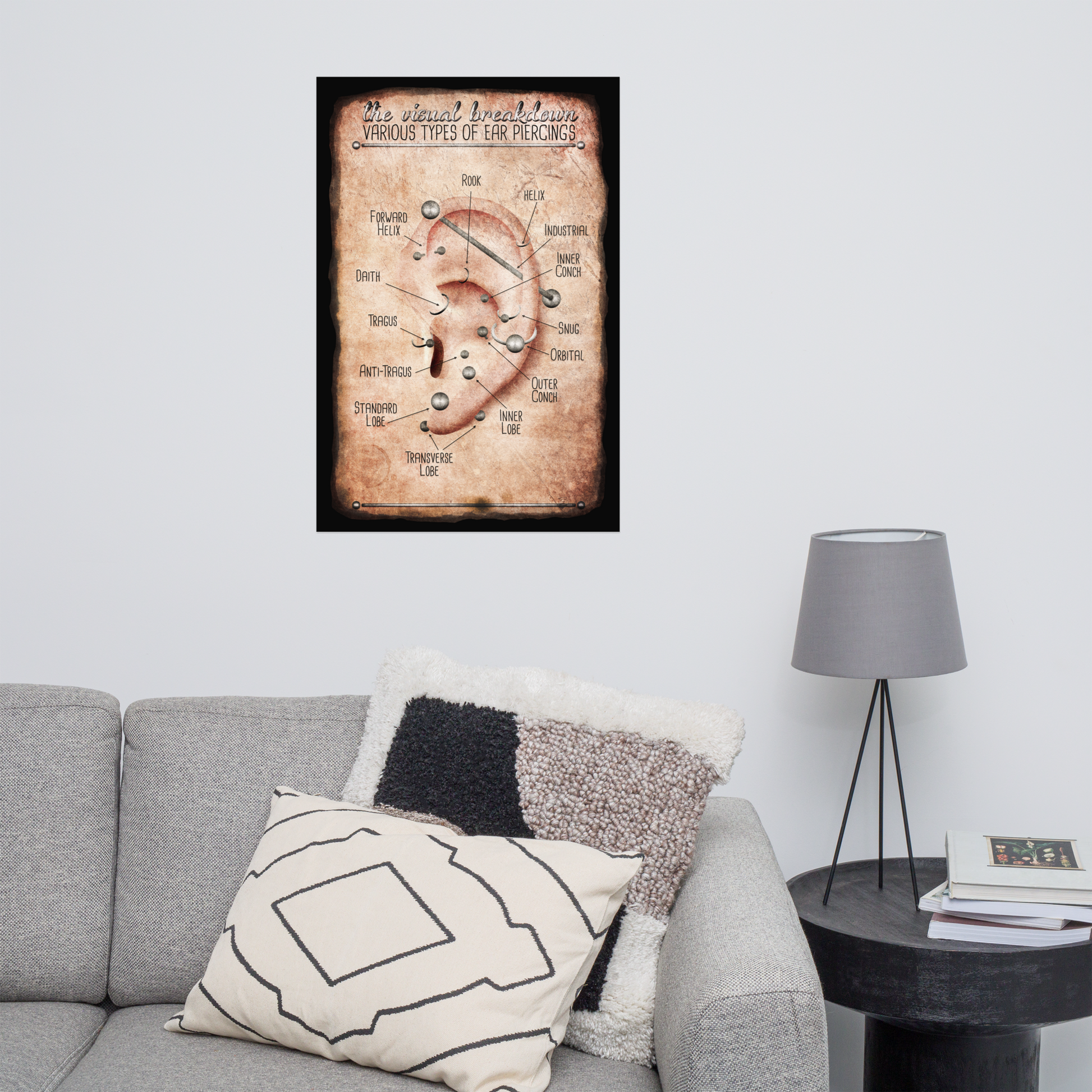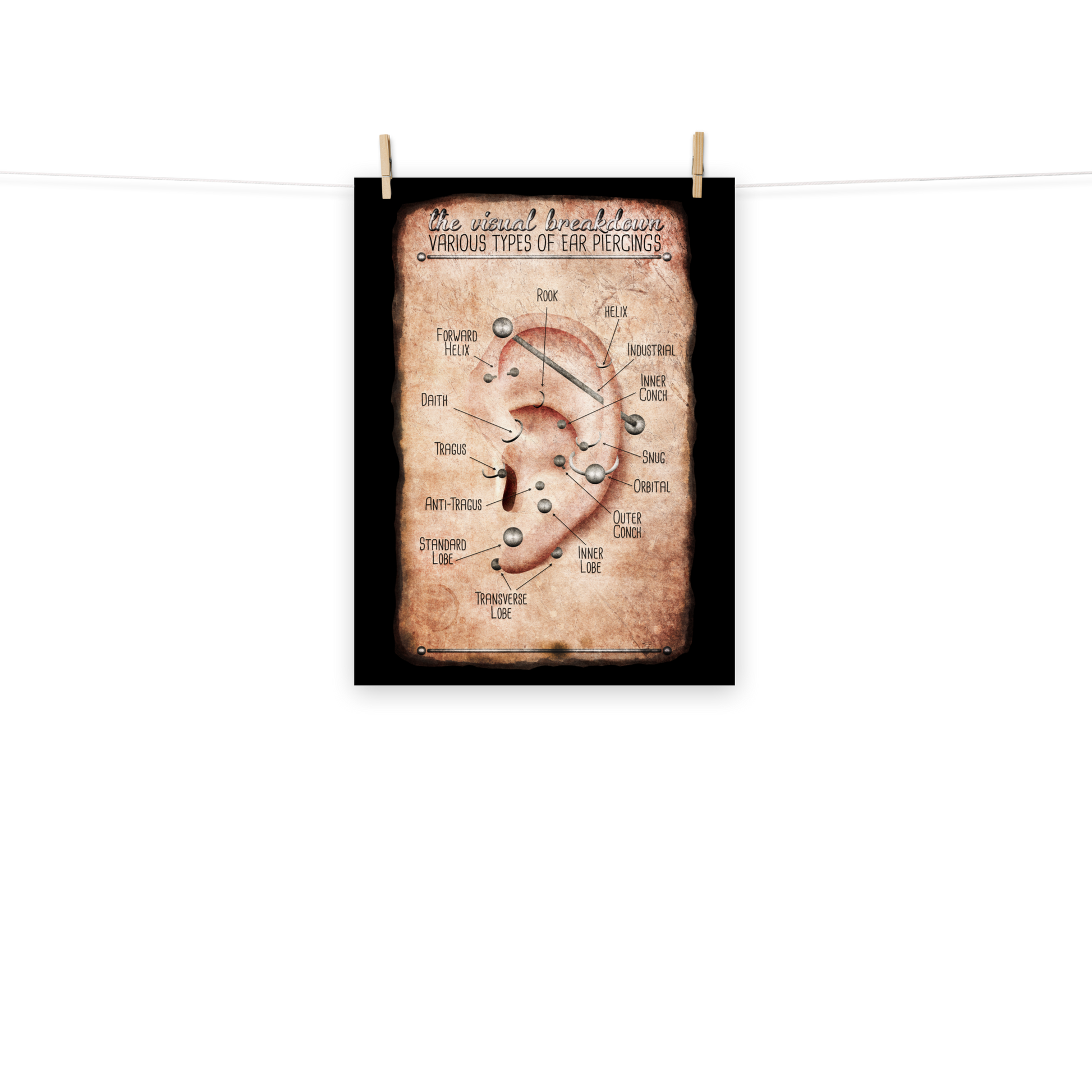 A vintage, old-style ear piercing infographic chart; complete and comprehensive on various ear piercings, their name and where they are.